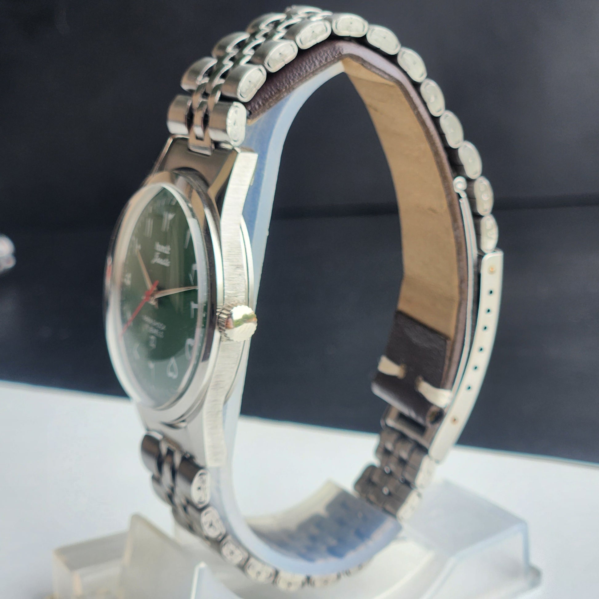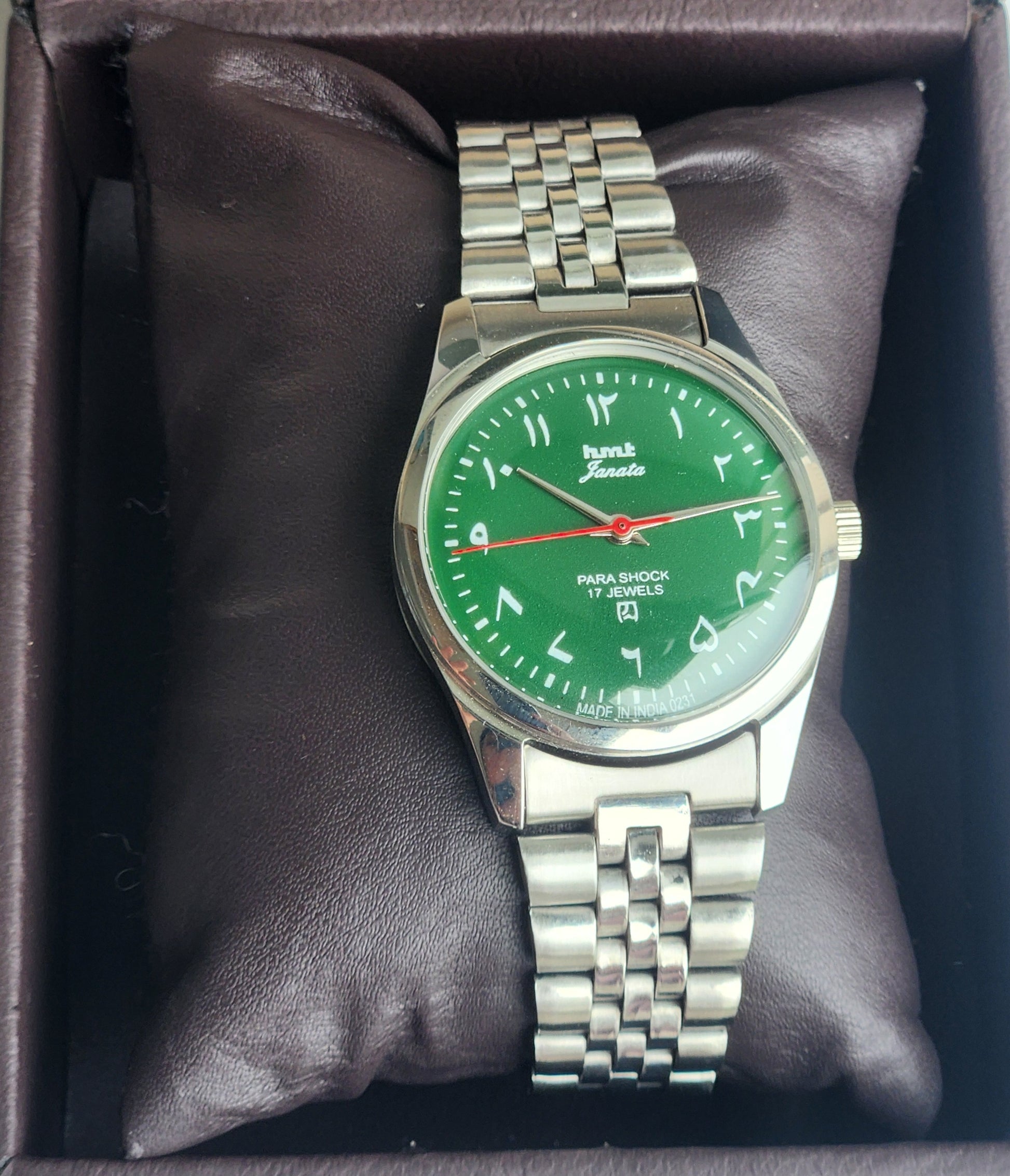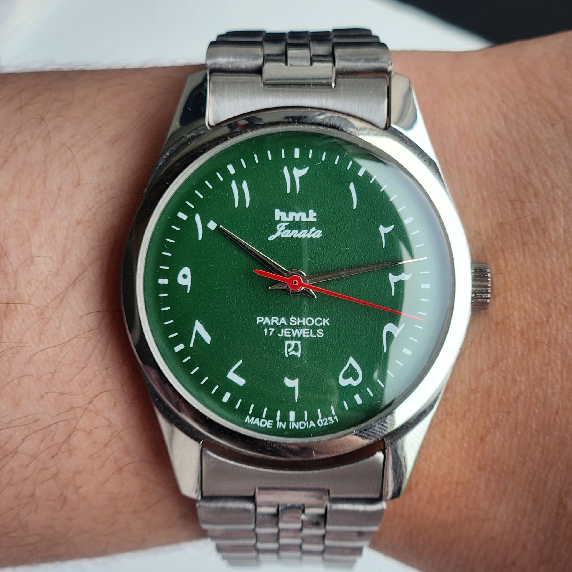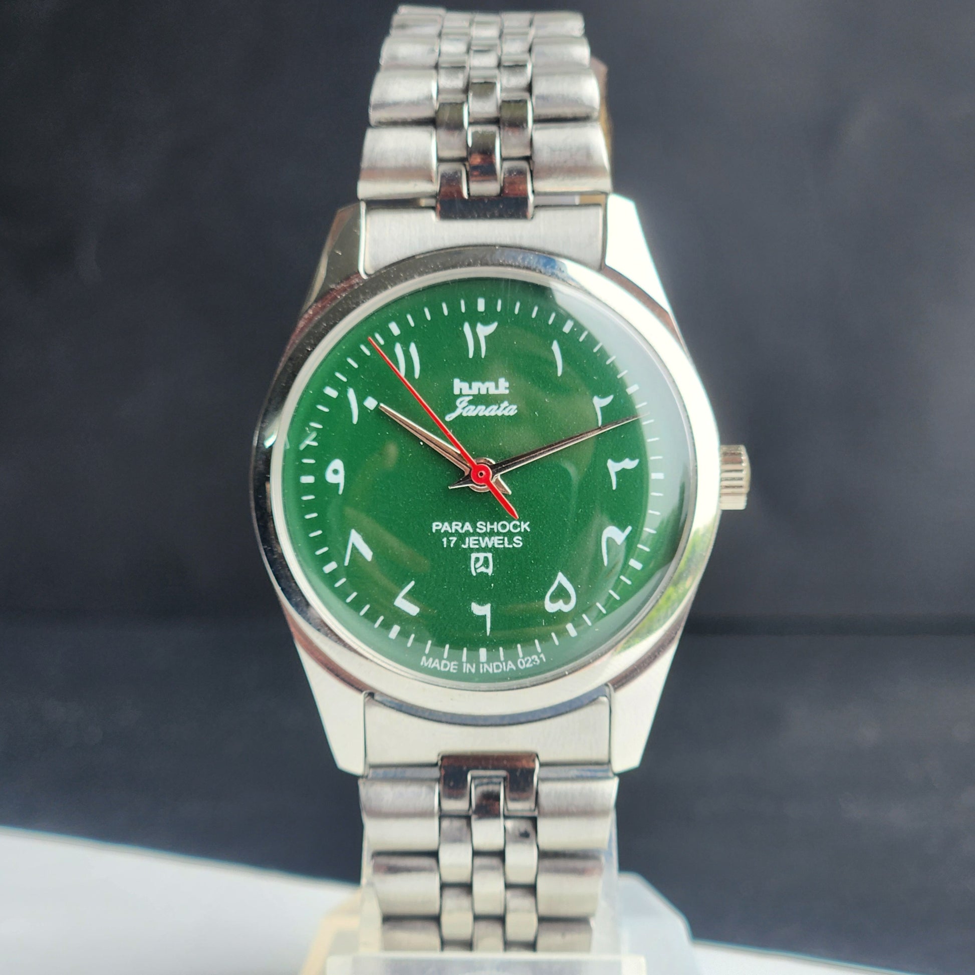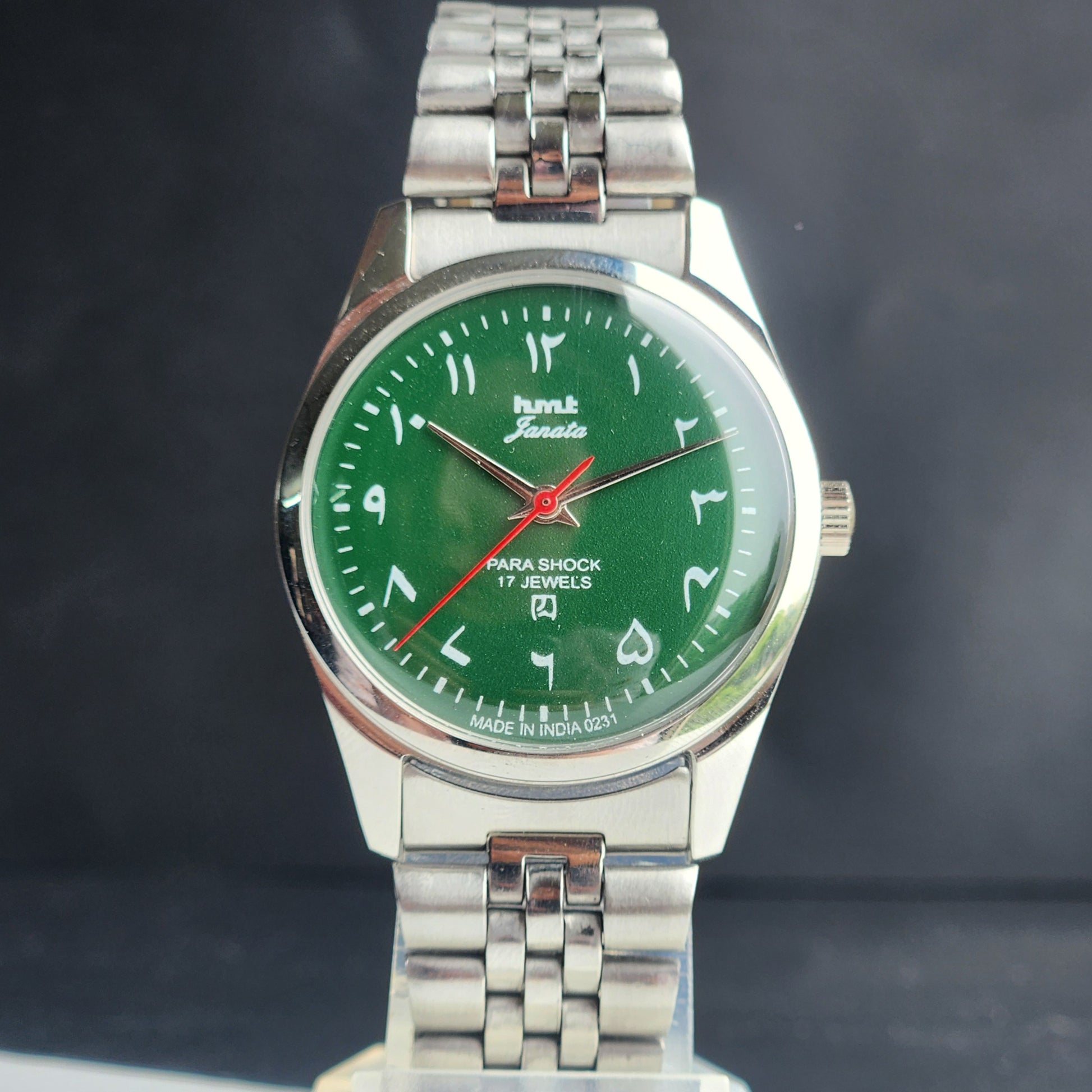Vintage MOD HMT Janata Urdu/Arabic Hand Winding 17 Jewels Green Face 35MM Silver Case Exhibition Back Men's Wrist Watch G54