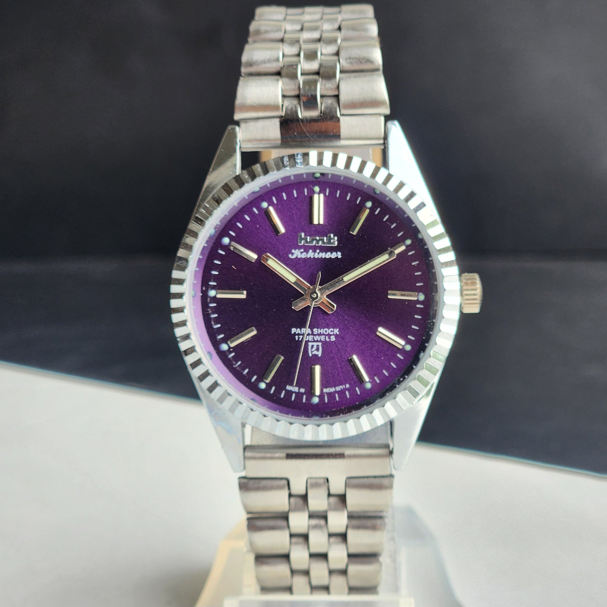 Vintage MOD HMT Kohinoor Hand Winding 17 Jewels Purple Face Fluted Bezel Jubilee Bracelet Men's Wrist Watch G10