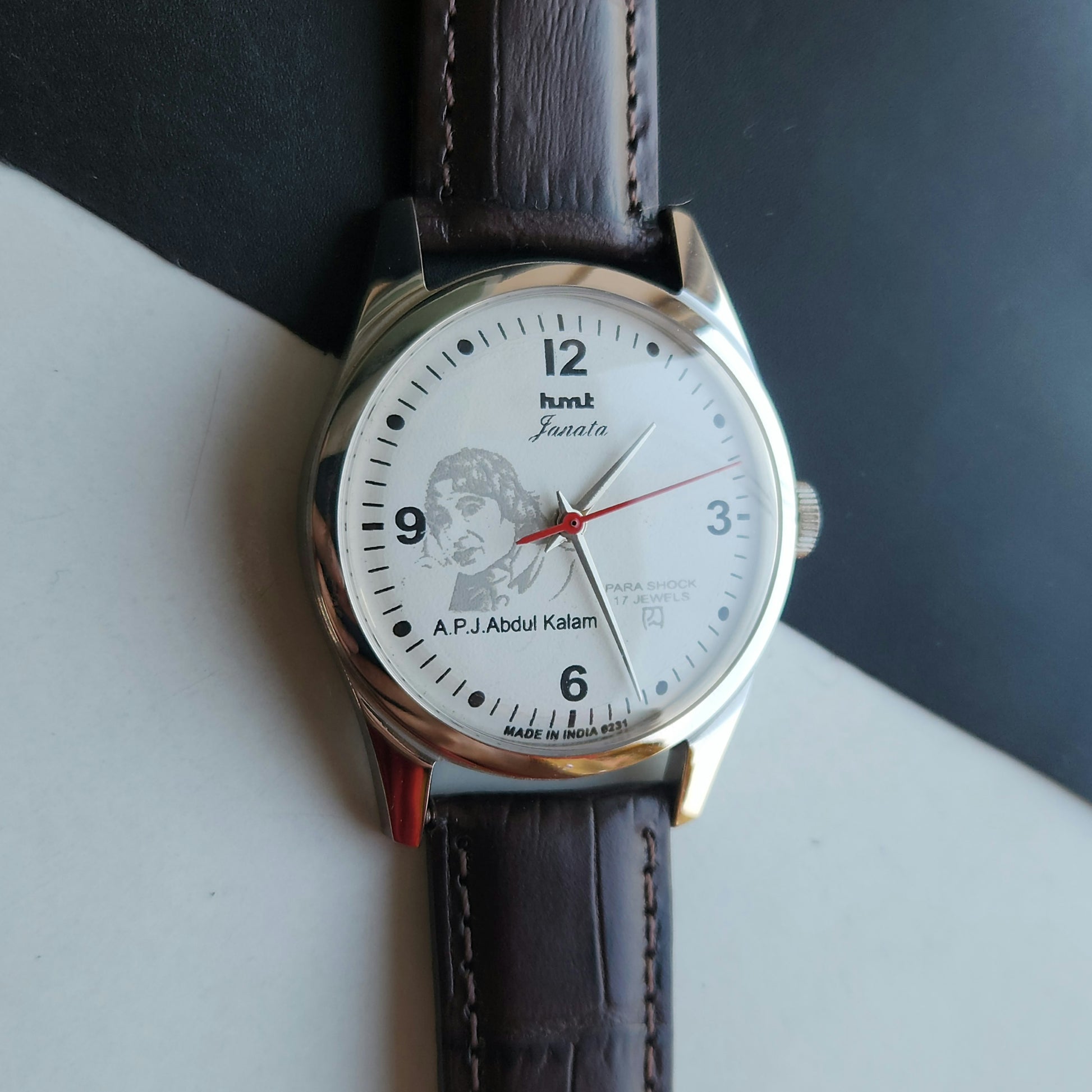 Vintage MOD HMT Janata A.P.J. Abdul Kalam Hand Winding 17 Jewels White Face Brown Leather Strap Men's Wrist Watch J23