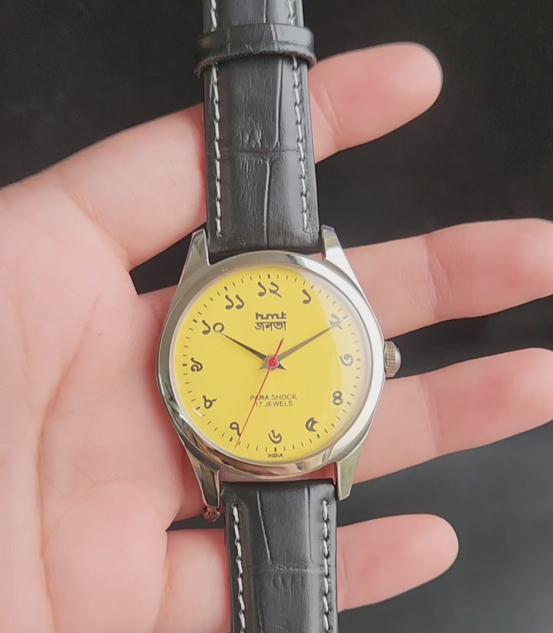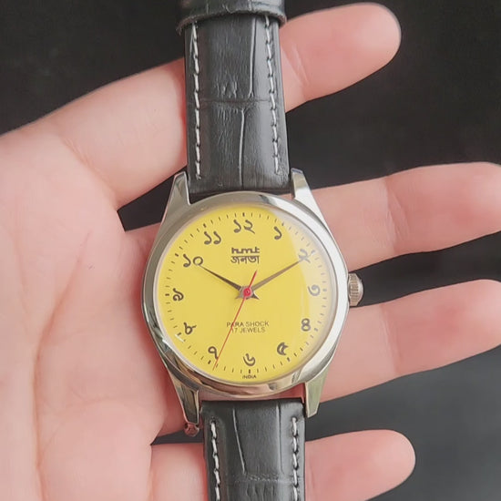 Vintage MOD HMT Janata Bangla Hand Winding 17 Jewels Yellow Face Black Leather Strap Men's Wrist Watch K15