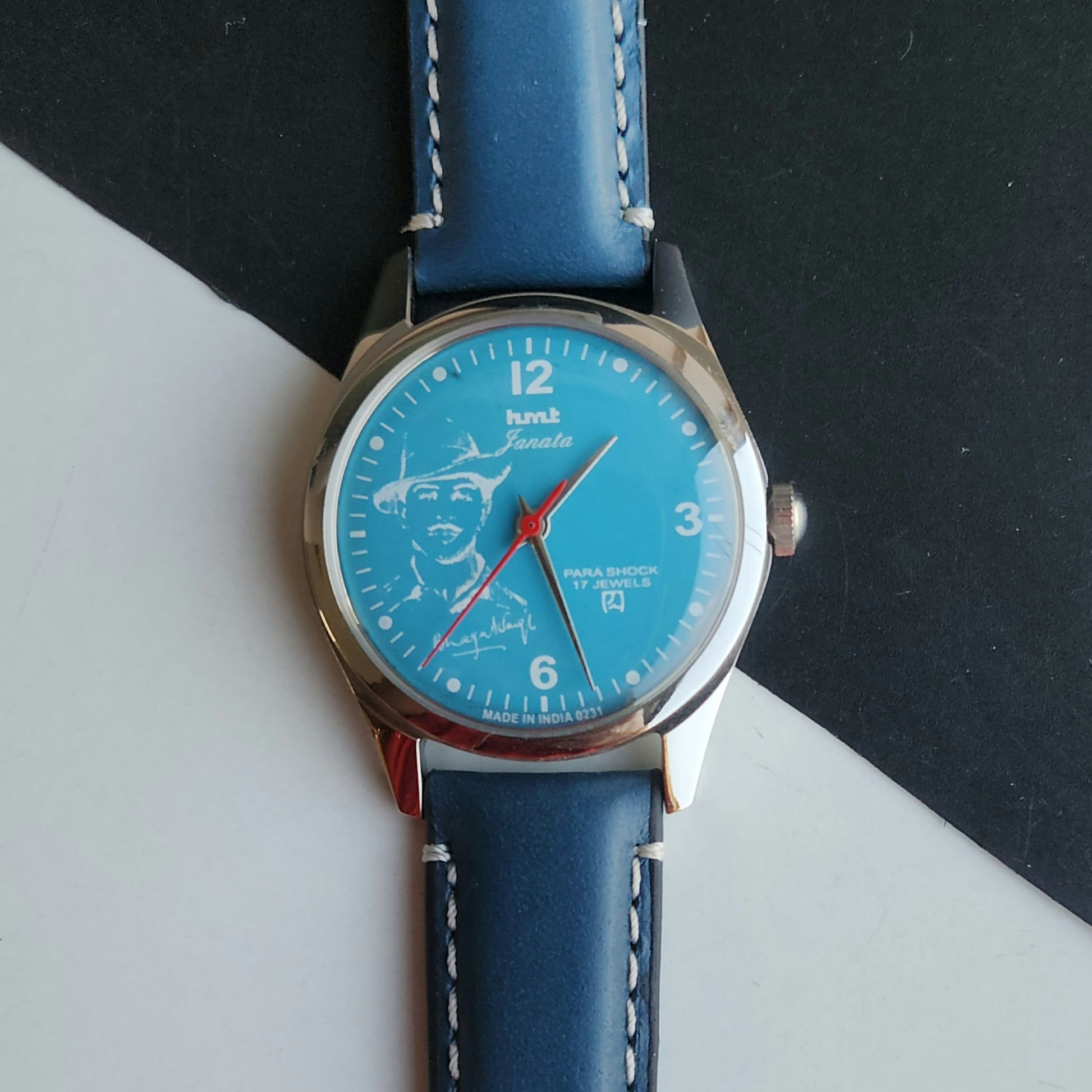 Vintage MOD HMT Janata Bhagat Singh Hand Winding 17 Jewels Blue Face Blue Leather Strap Men's Wrist Watch J28