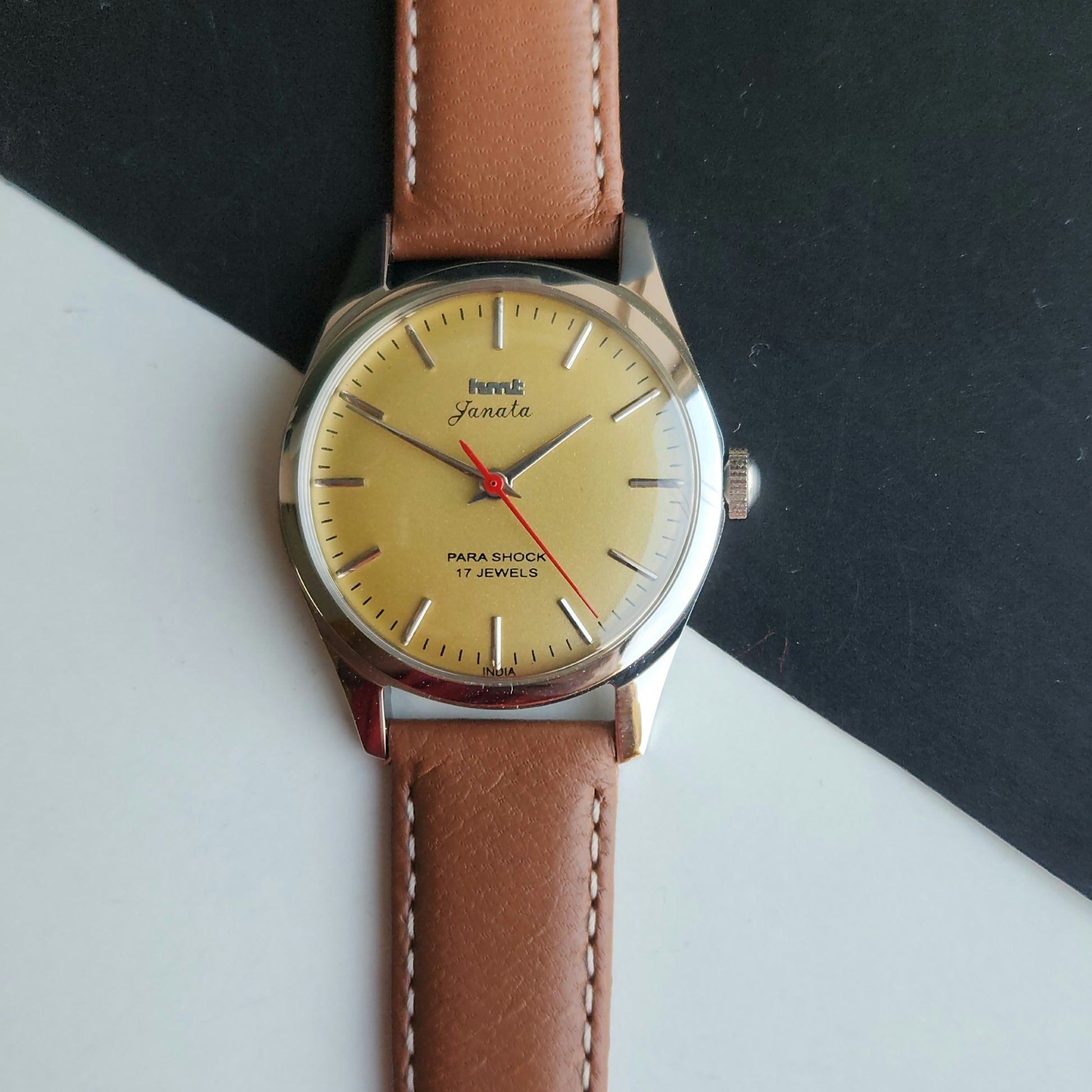 Vintage MOD HMT Janata Bangla Hand Winding 17 Jewels Peach Face Tan Leather Strap Men's Wrist Watch J36