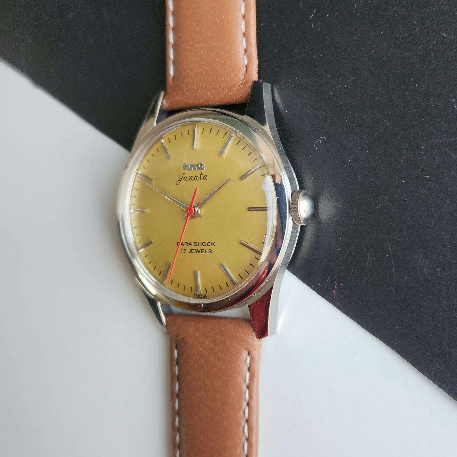 Vintage MOD HMT Janata Hand Winding 17 Jewels Yellow Face Brown Leather Strap Men's Wrist Watch J19