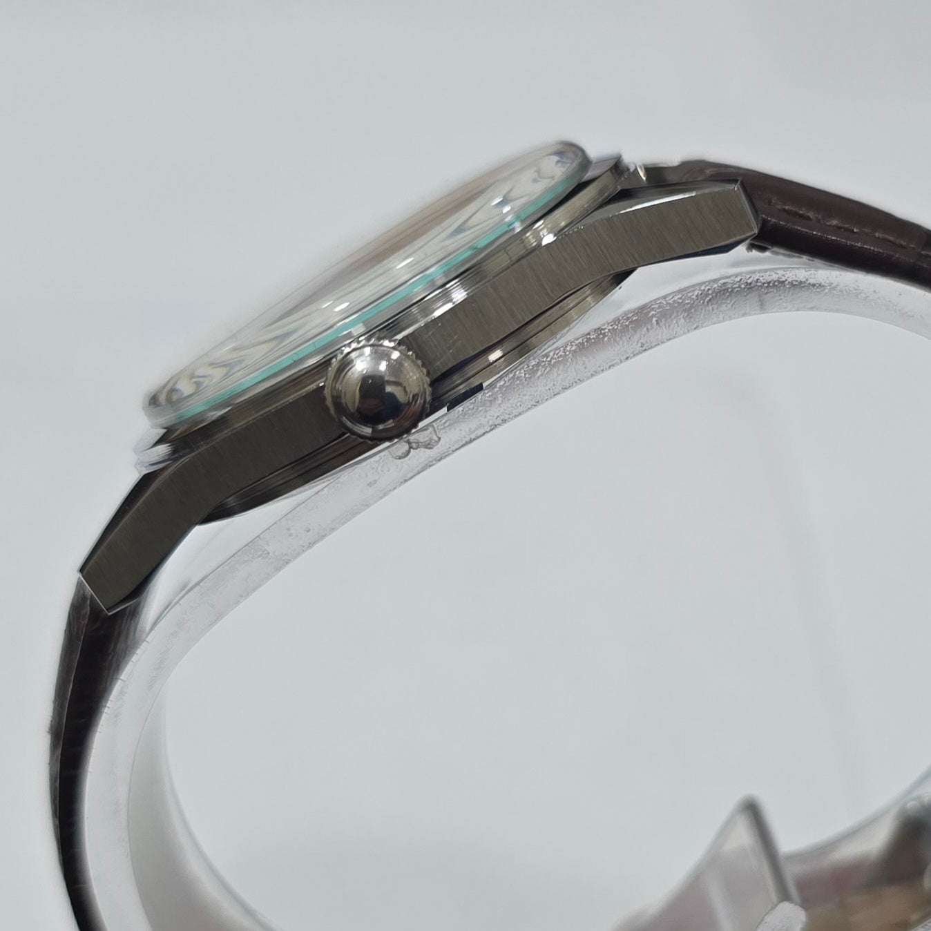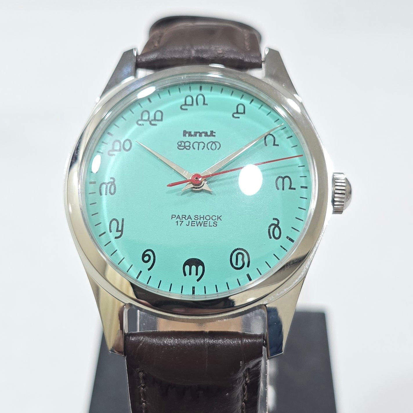 Vintage MOD HMT Janata Malayalam Hand Winding 17 Jewels Sea Green Face Brown Leather Strap Men's Wrist Watch K02