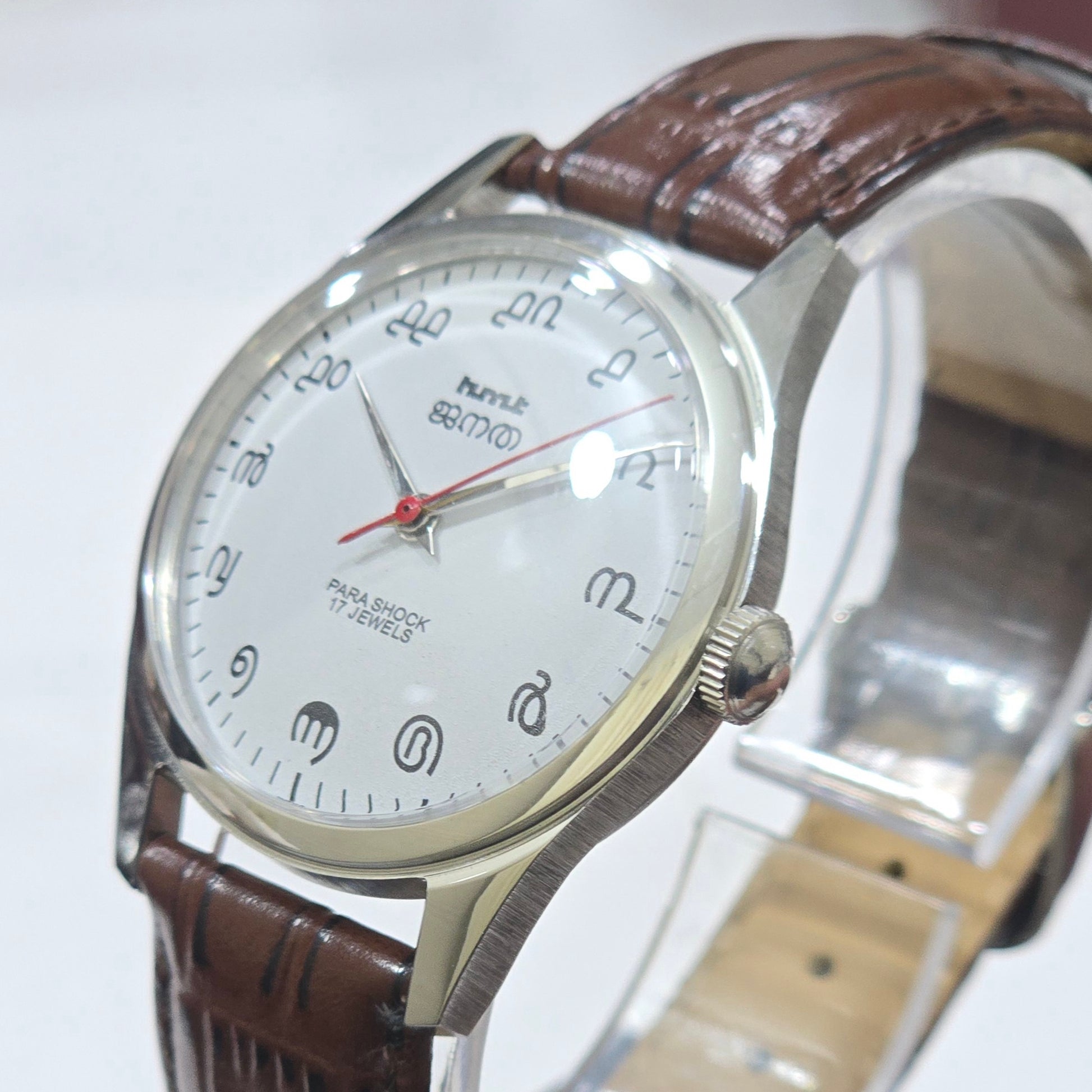 Vintage MOD HMT Janata Malayalam Hand Winding 17 Jewels White Face Brown Leather Strap Men's Wrist Watch K06