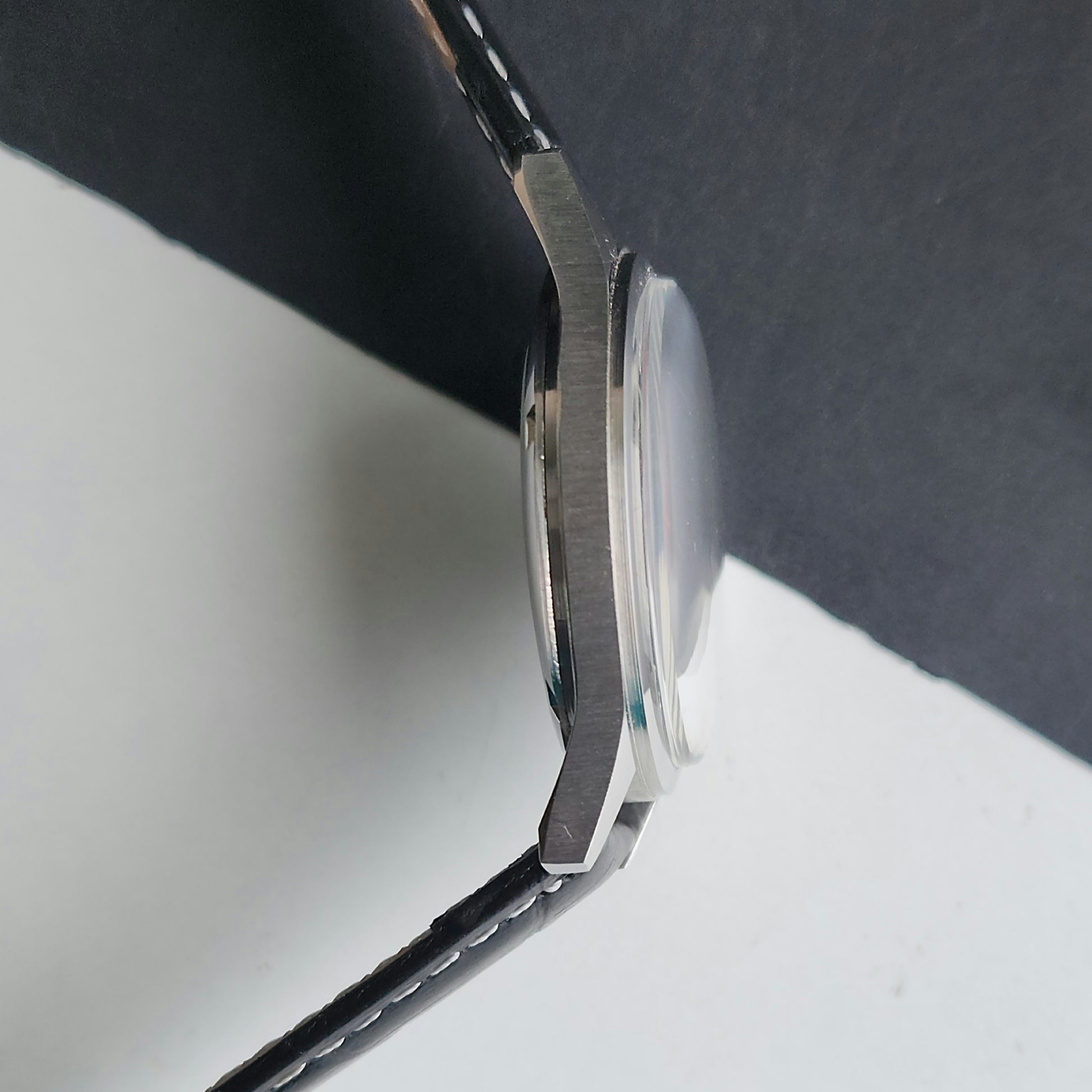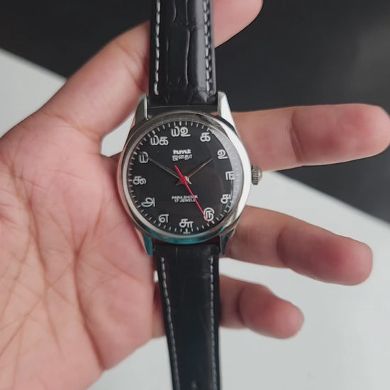 Vintage MOD HMT Janata Tamil Hand Winding 17 Jewels Black Face 35mm Silver Case With Black Leather Strap Men's Wrist Watch J79