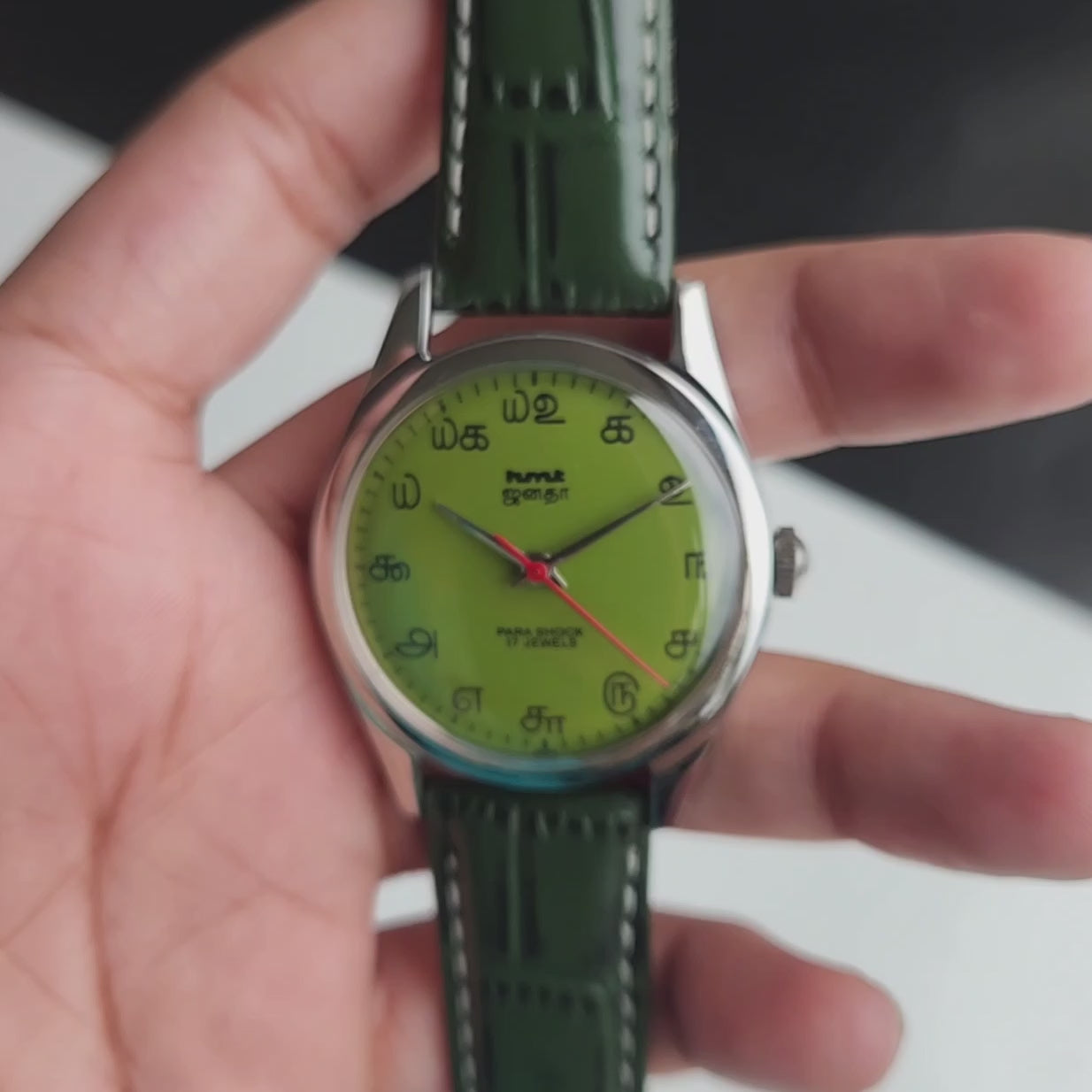 Vintage MOD HMT Janata Tamil Hand Winding 17 Jewels Parrot Green Face 35mm Silver Case With Green Leather Strap Men's Wrist Watch J81