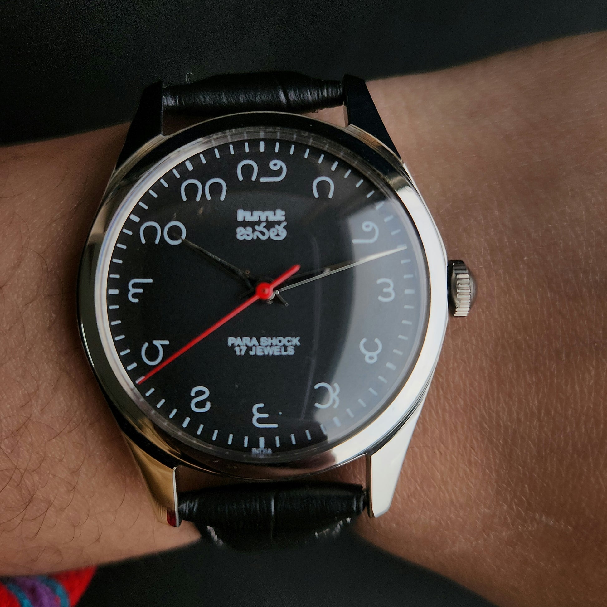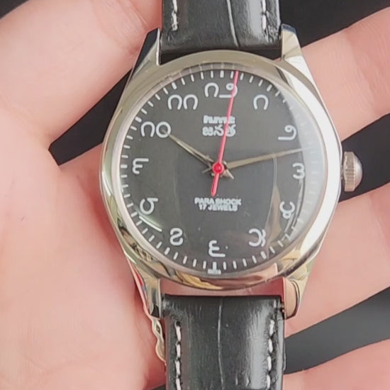 Vintage MOD HMT Janata Telugu Hand Winding 17 Jewels Black Face Black Leather Strap Men's Wrist Watch K08