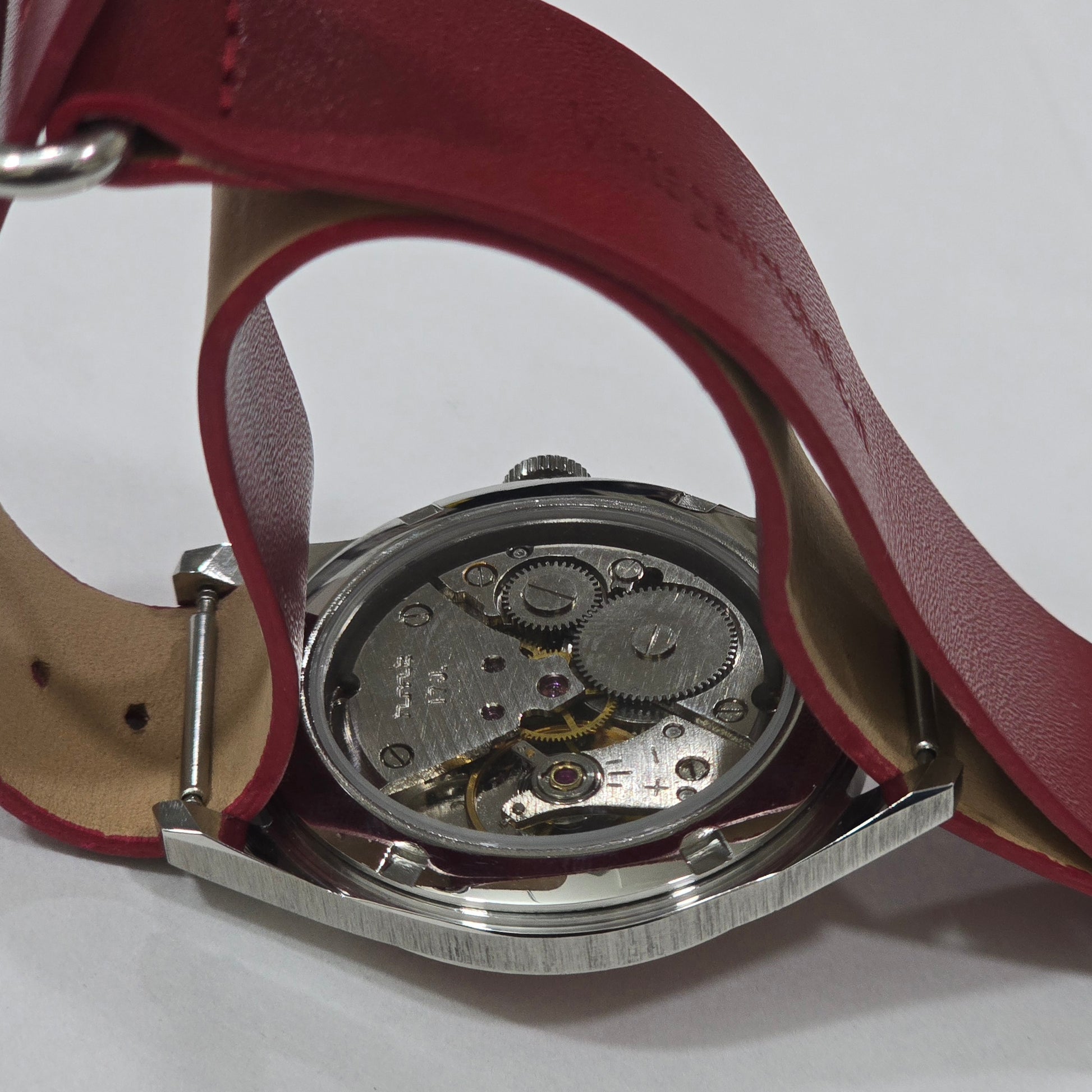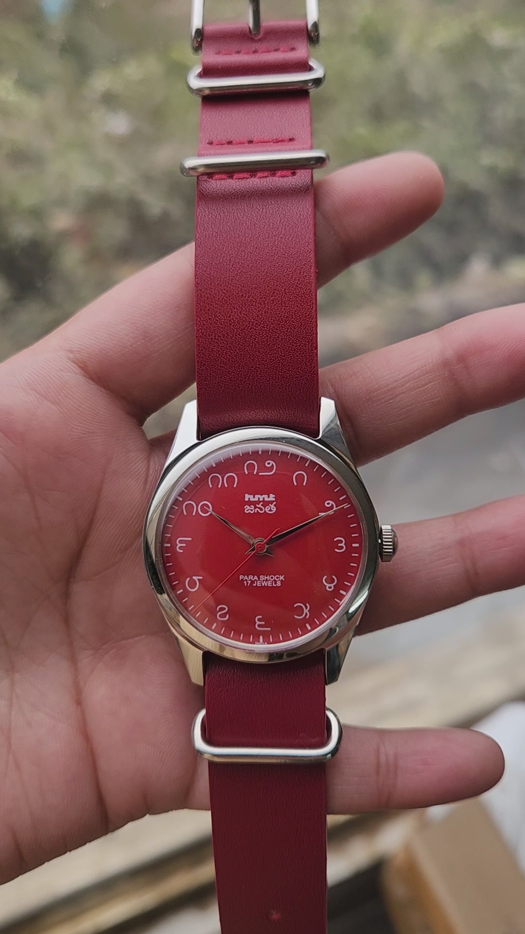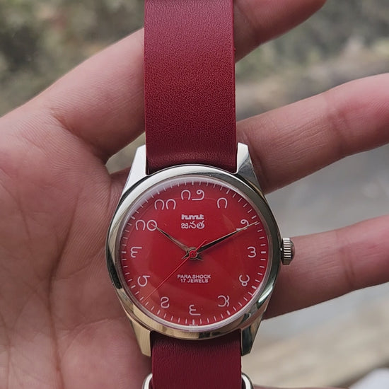 Vintage MOD HMT Janata Telugu Hand Winding 17 Jewels Red Face Red Nato Leather Strap Men's Wrist Watch K12