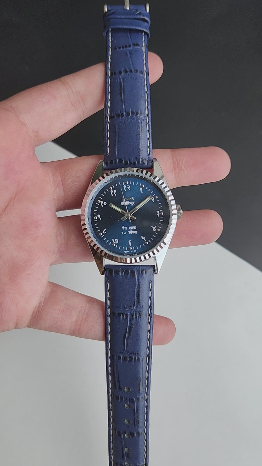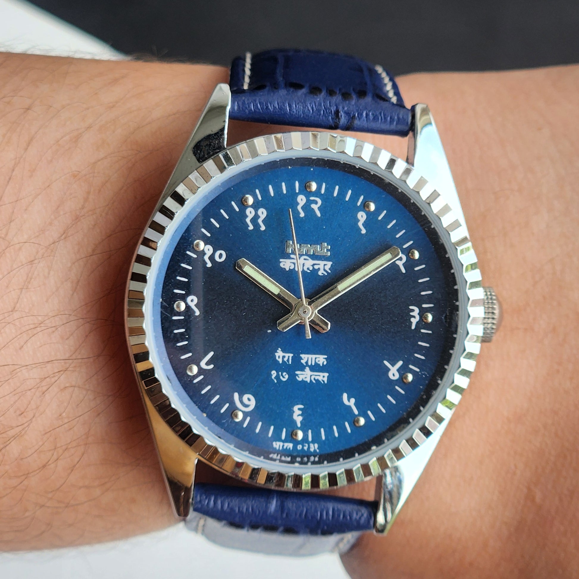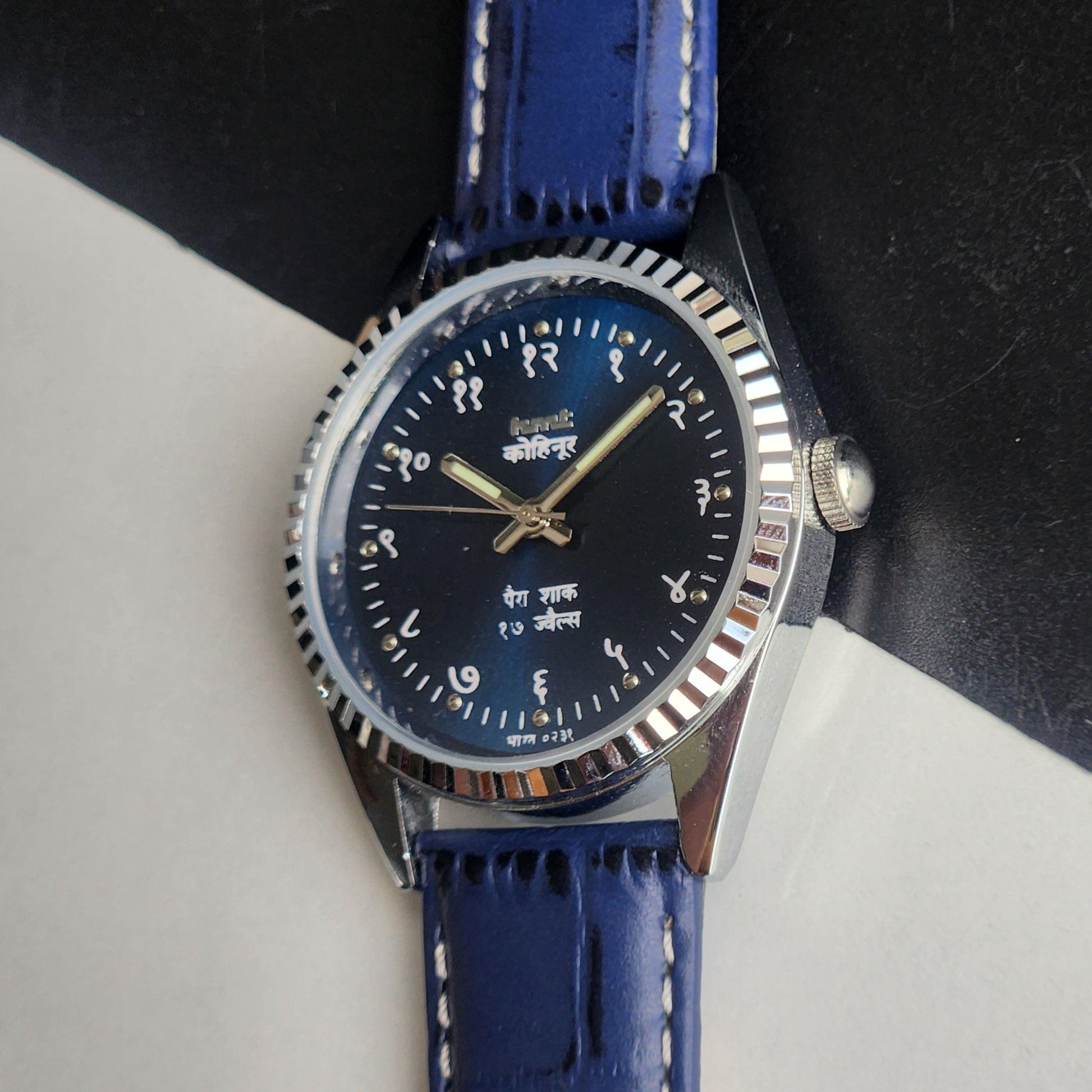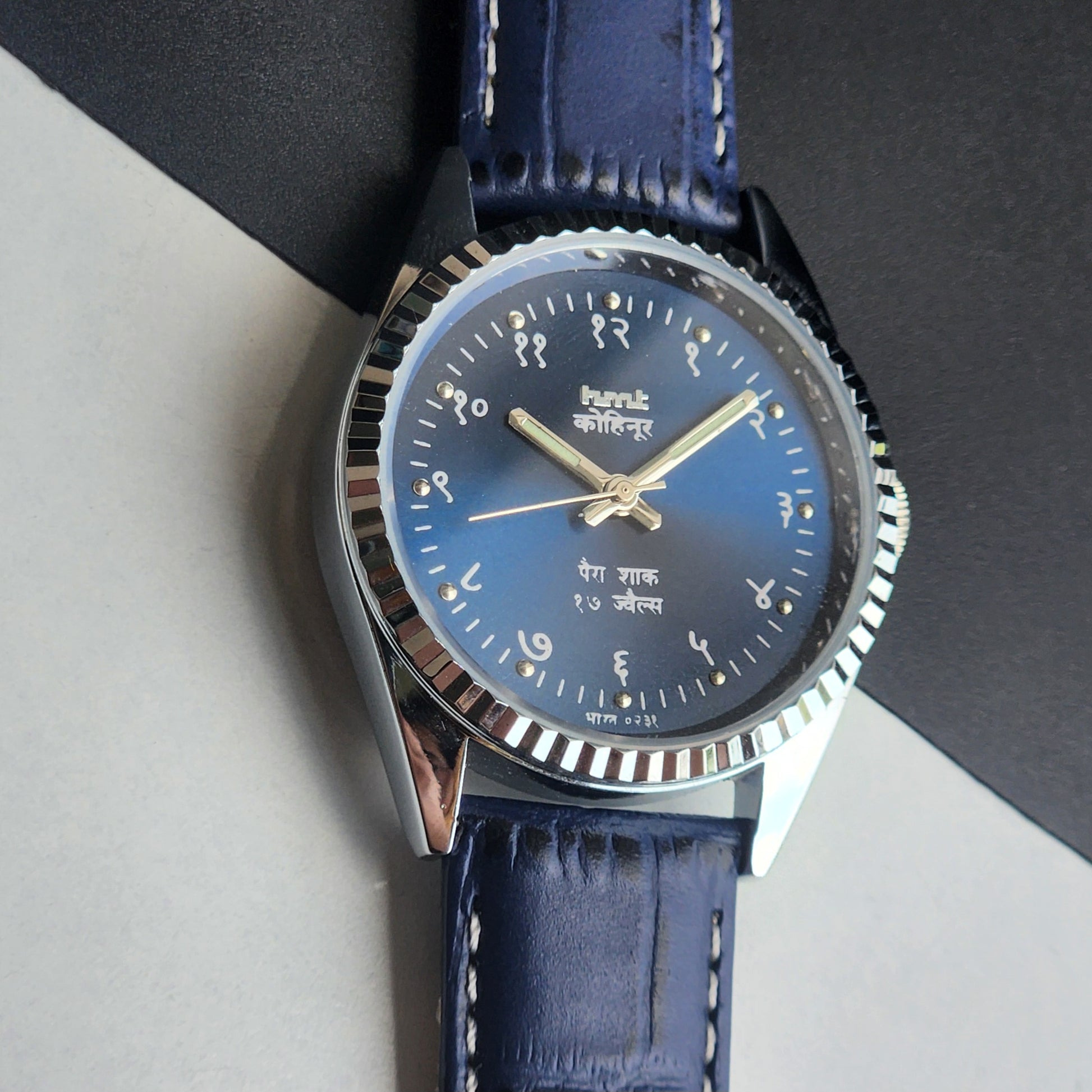 Vintage Mod HMT Kohinoor Devanagari Hand Winding 17 Jewels Blue Face Fluted Bezel Blue Croco Leather Strap Men's Wrist Watch J03