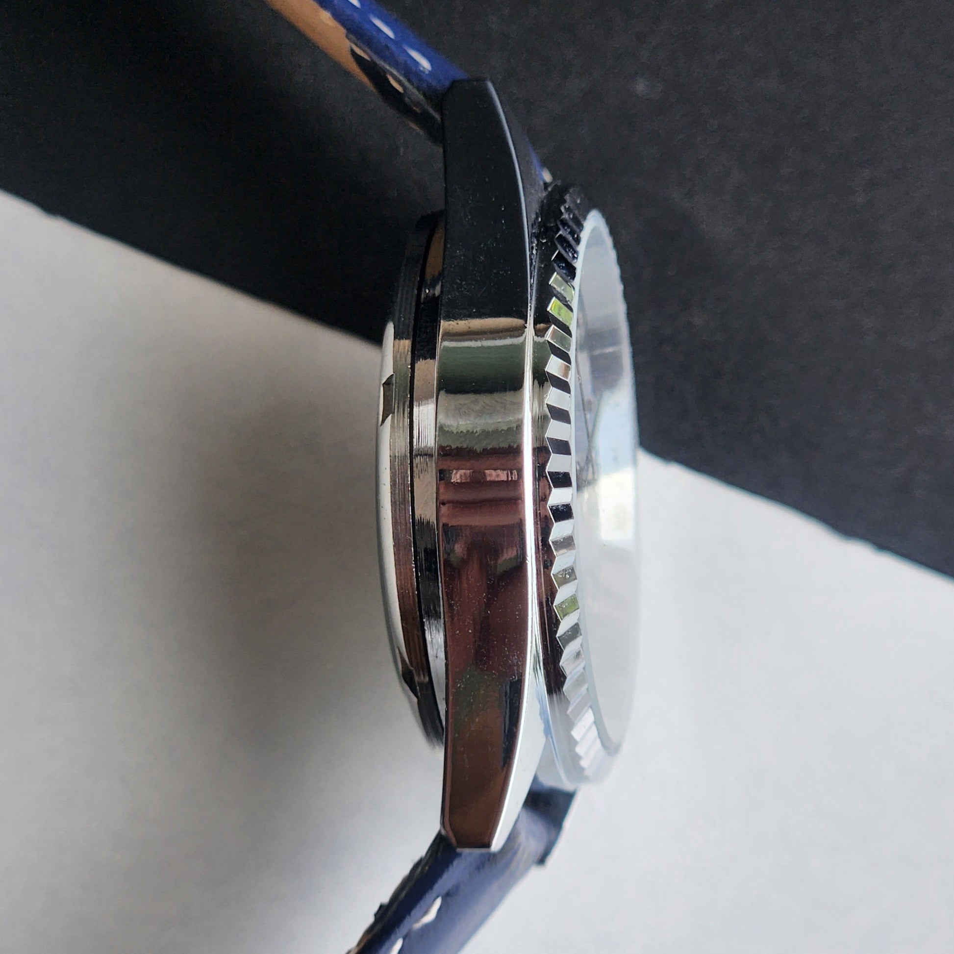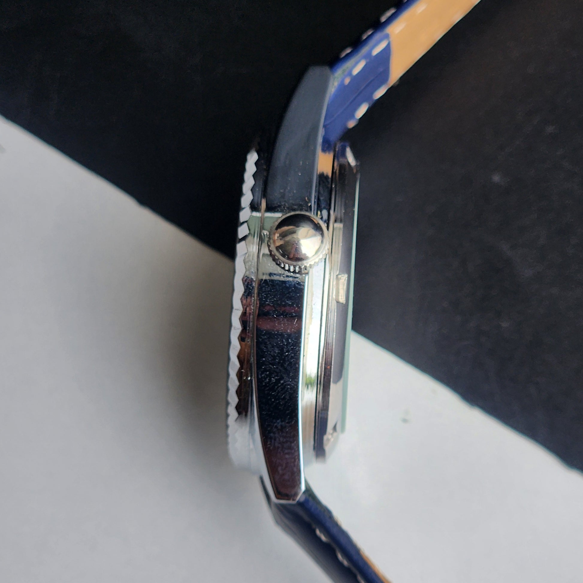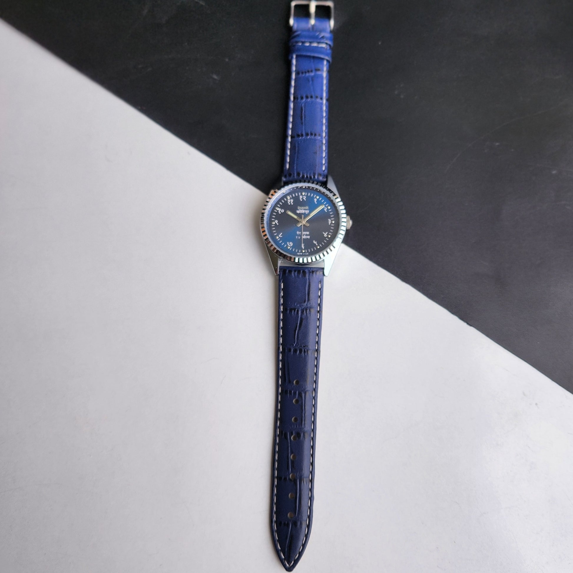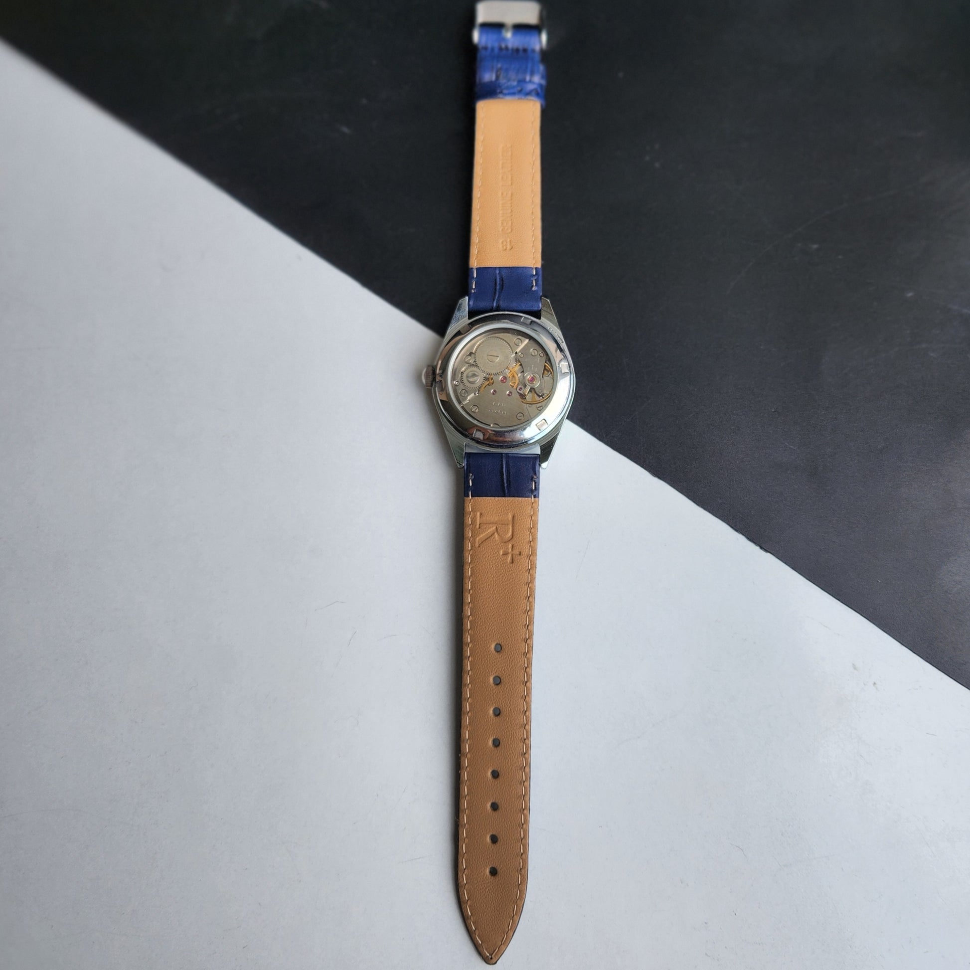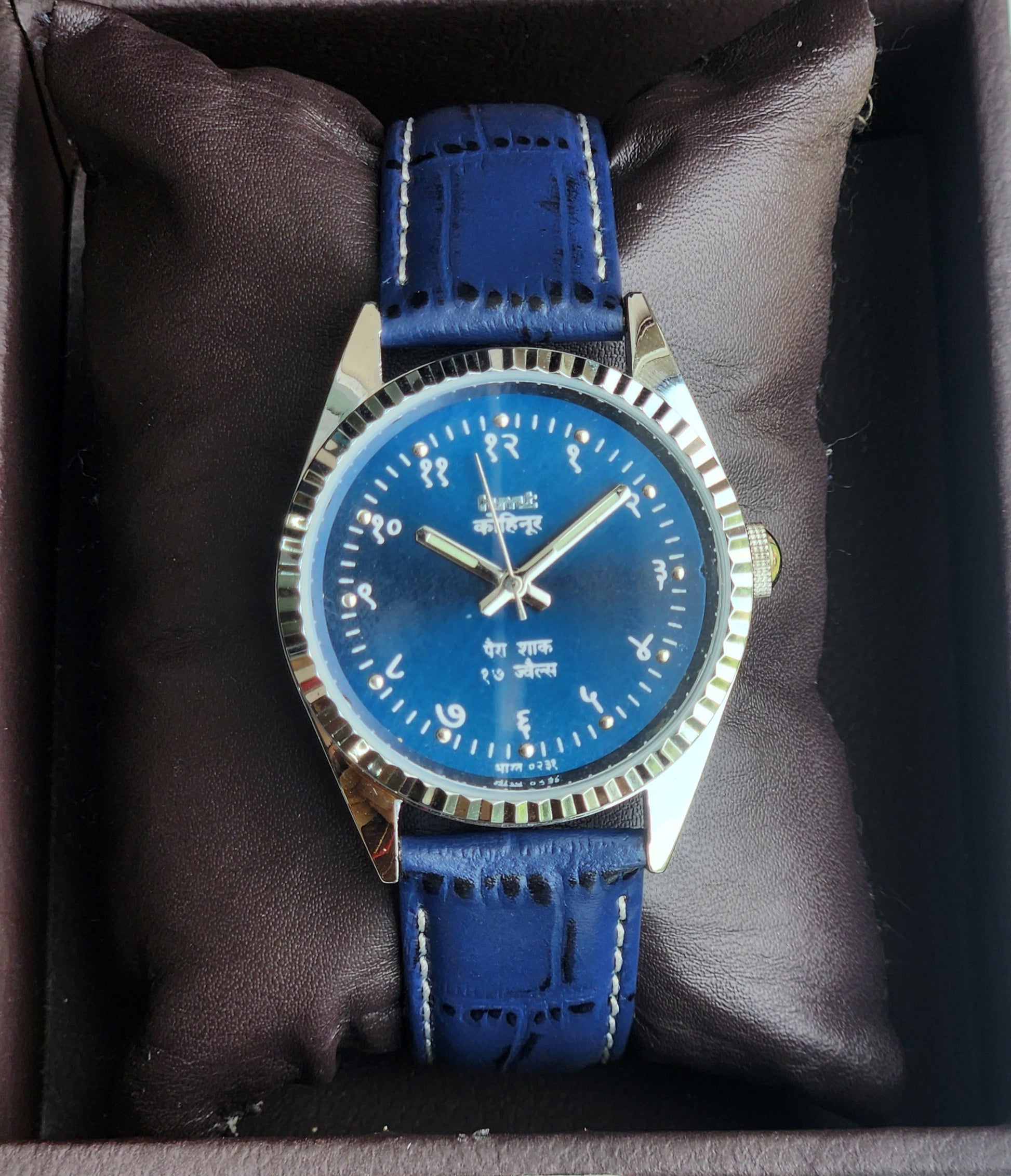 Vintage Mod HMT Kohinoor Devanagari Hand Winding 17 Jewels Blue Face Fluted Bezel Blue Croco Leather Strap Men's Wrist Watch J03