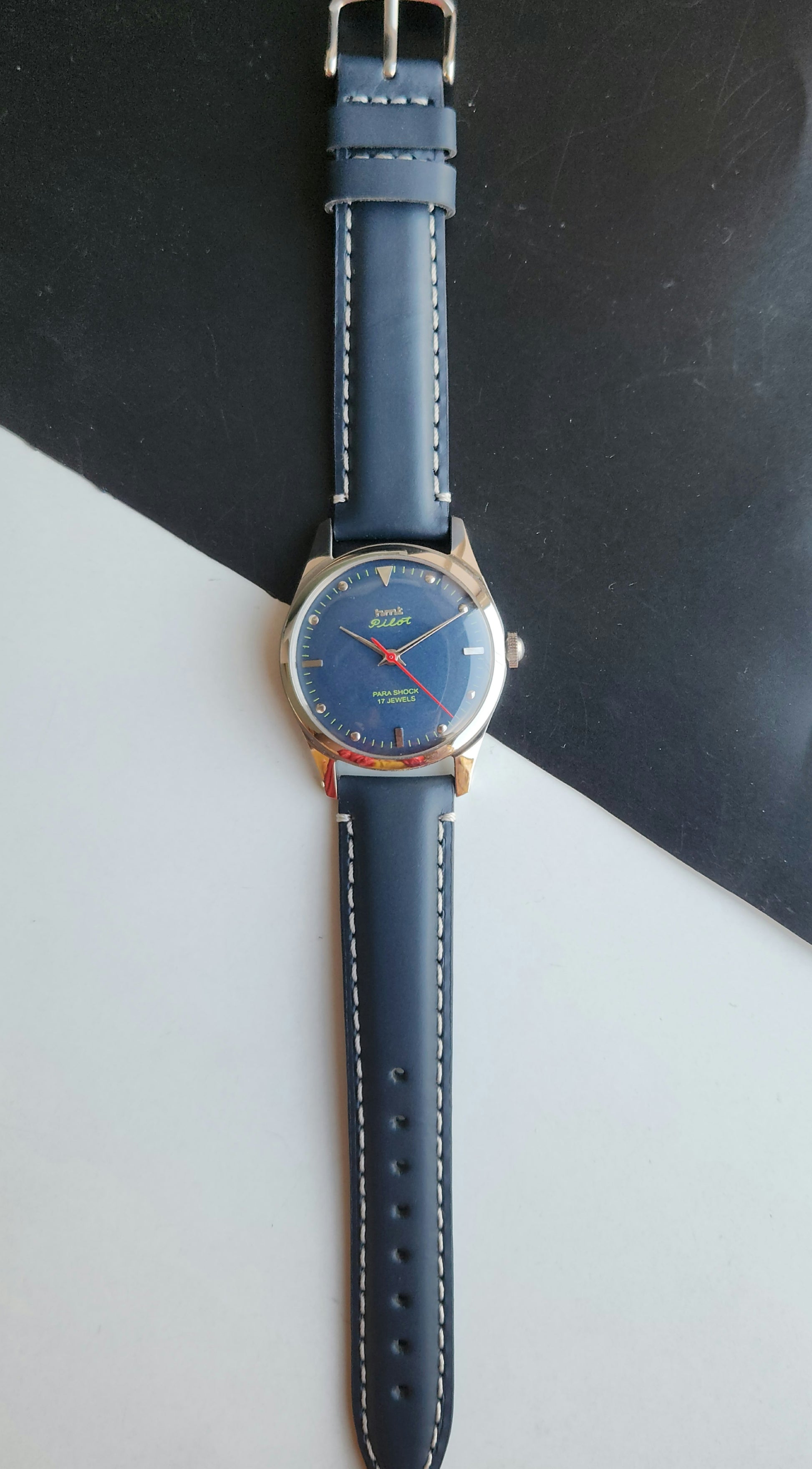 Vintage MOD HMT Pilot Hand Winding 17 Jewels Blue Face Blue Leather Strap Men's Wrist Watch J22