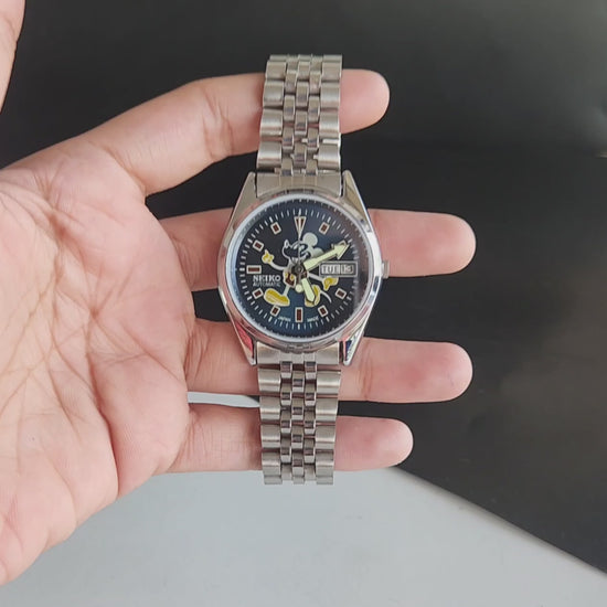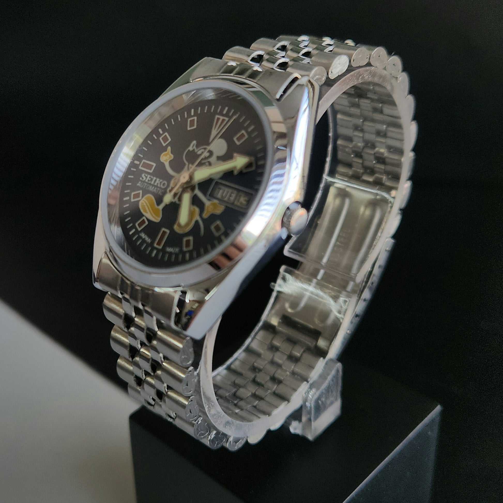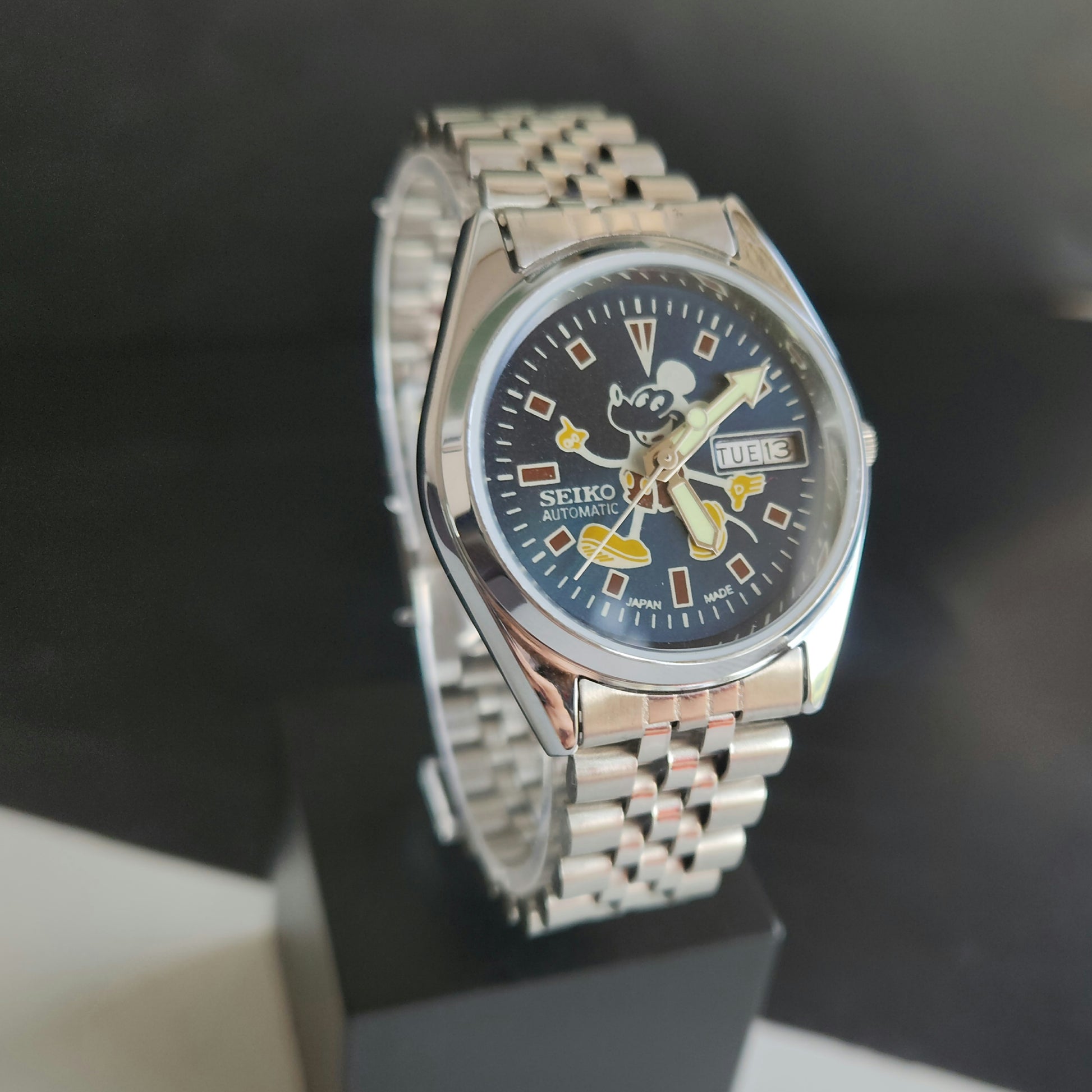 Vintage MOD Seiko 5 Automatic 17 Jewels Cal.6309 Blue Face Repainted Mickey Mouse Jubilee Bracelet Men's Wrist Watch J55