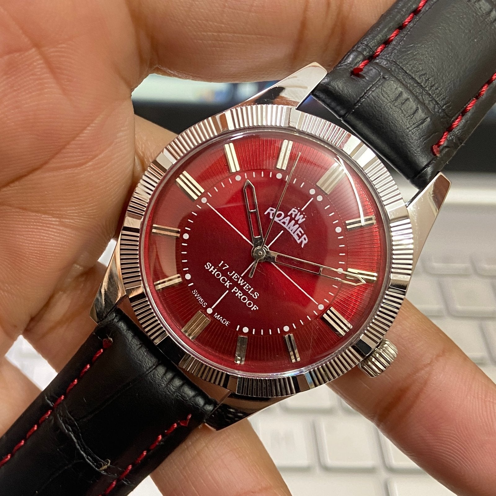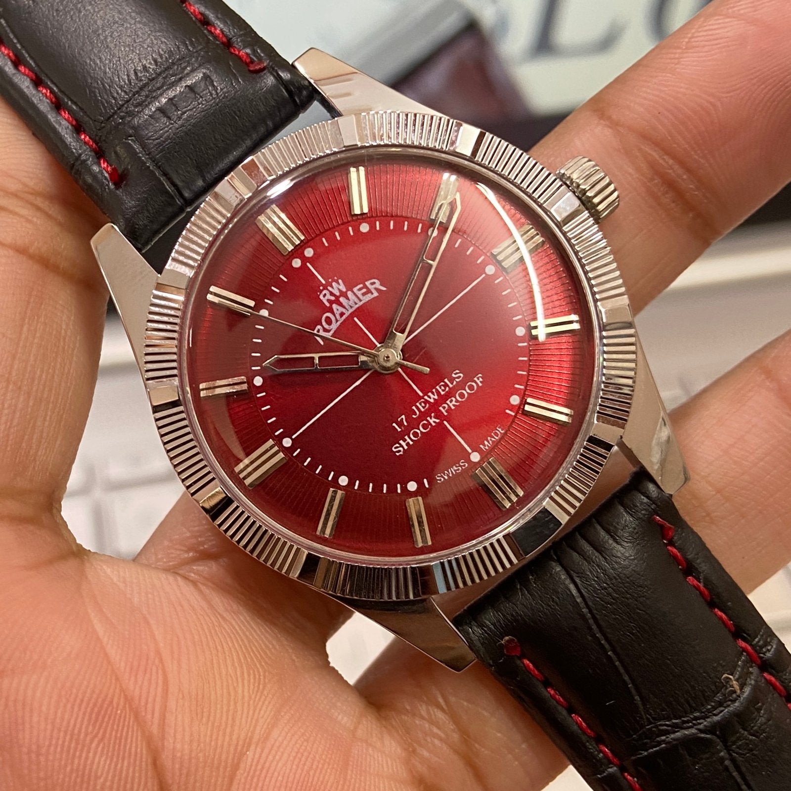 Vintage Roamer Red Face Silver Case Mechanical Hand Winding 17 jewels Fluted Bezel Black Band Men's Wrist Watch D82